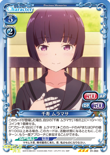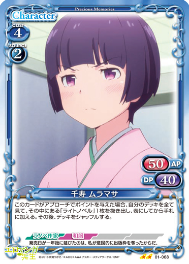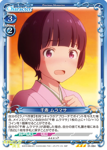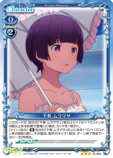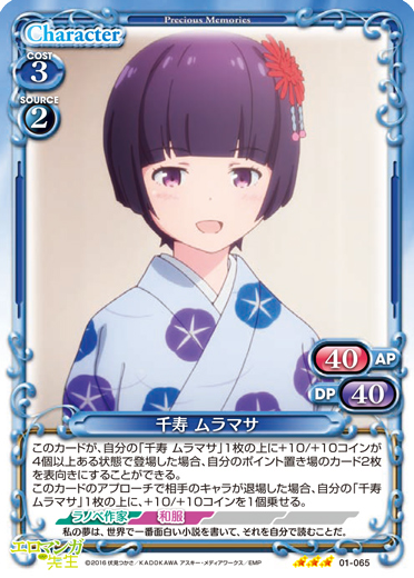 | 自分の【ラノベ作家】を持つキャラがアプローチでポイントを与えた場合、メインエリアにいる自分の「千寿 ムラマサ」1枚の上に+10/+10コインを1個乗せることができる。自分の「千寿 ムラマサ」が退場した場合、自分の捨て札置き場にある「告白」1枚を手札に戻すことができる。 | ||