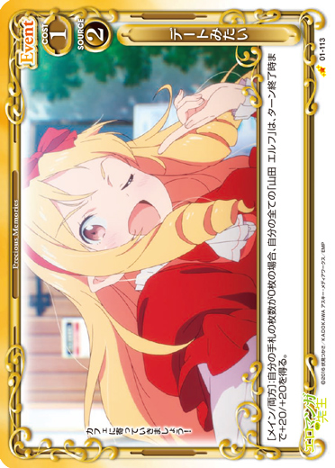 | [メイン/両方]:自分の手札の枚数が0枚の場合、自分の全ての「山田 エルフ」は、ターン終了時まで+20/+20を得る。 | ||