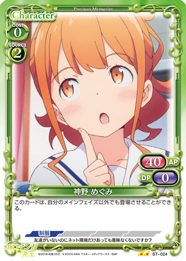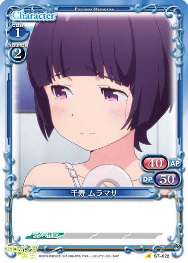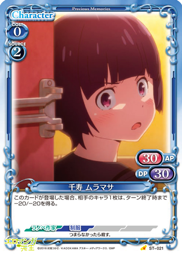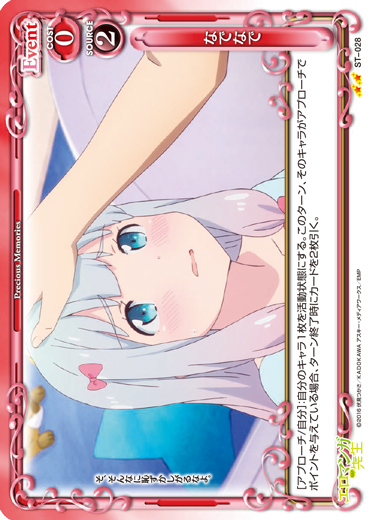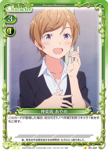 | このカードが登場した場合、自分の【ラノベ作家】を持つキャラ1枚を手札に戻す。 | ||