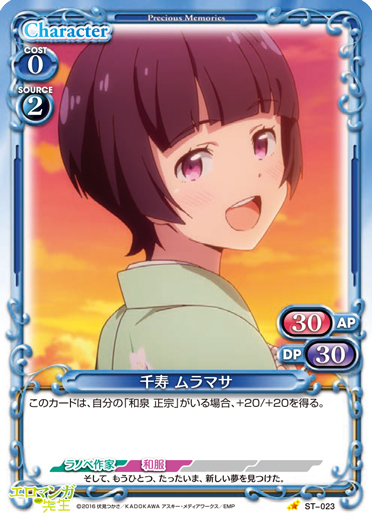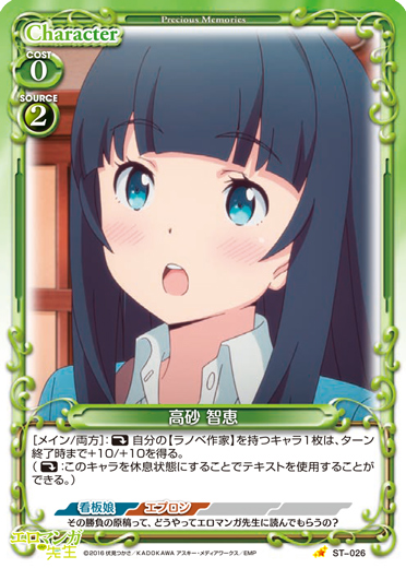 | [メイン/両方]:《休》自分の【ラノベ作家】を持つキャラ1枚は、ターン終了時まで+10/+10を得る。(《休》:このキャラを休息状態にすることでテキストを使用することができる。) | ||