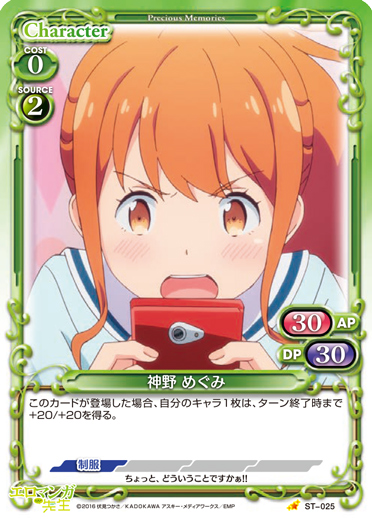 | このカードが登場した場合、相手のキャラ1枚は、ターン終了時まで-20/-20を得る。 | ||