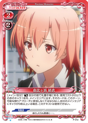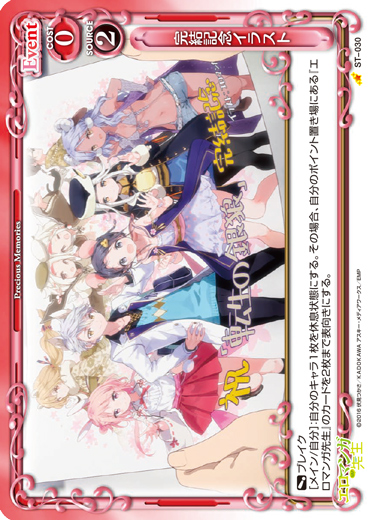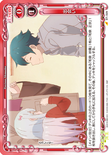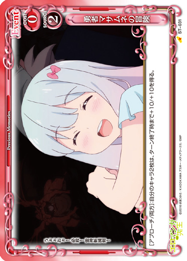 | 〔ブレイク〕[メイン/自分]:自分のキャラ1枚を休息状態にする。その場合、自分のポイント置き場にある『エロマンガ先生』のカードを2枚まで表向きにする。 | ||