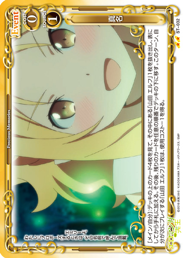 | [メイン/自分]:デッキの上のカード4枚を見て、その中にある「山田 エルフ」1枚を抜き出し、表にしてから手札に加える。その後、残りのカードを任意の順番でデッキの下に移す。このターン、自分が次にプレイする「山田 エルフ」1枚は、使用コスト-1を得る。 | ||
