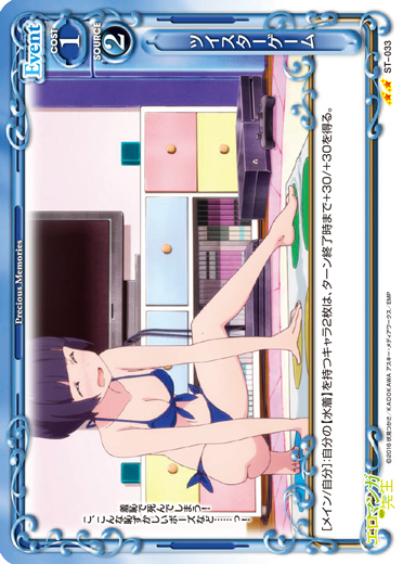 | [メイン/自分]:自分の【水着】を持つキャラ2枚は、ターン終了時まで+30/+30を得る。 | ||