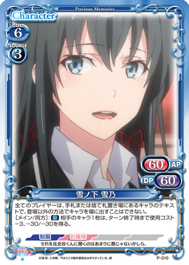| 全てのプレイヤーは、手札または捨て札置き場にあるキャラのテキストで、登場以外の方法でキャラを場に出すことができない。[メイン/両方]:《青3》相手のキャラ1枚は、ターン終了時まで使用コスト-3、-30/-30を得る。 | ||