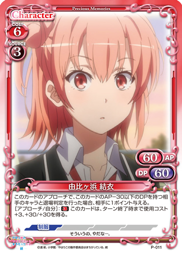 | このカードのアプローチで、このカードのAP-30以下のDPを持つ相手のキャラと退場判定を行った場合、相手に1ポイント与える。[アプローチ/自分]:《赤3》このカードは、ターン終了時まで使用コスト+3、+30/+30を得る。 | ||