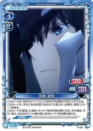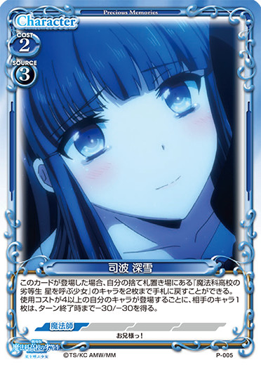 | このカードが登場した場合、自分の捨て札置き場にある『魔法科高校の劣等生 星を呼ぶ少女』のキャラを2枚まで手札に戻すことができる。使用コストが4以上の自分のキャラが登場するごとに、相手のキャラ1枚は、ターン終了時まで-30/-30を得る。 | ||