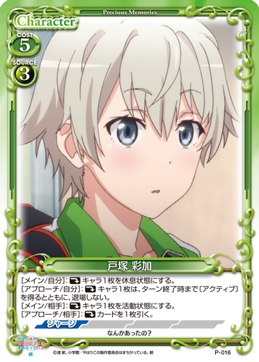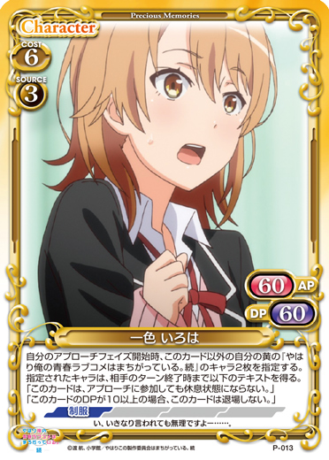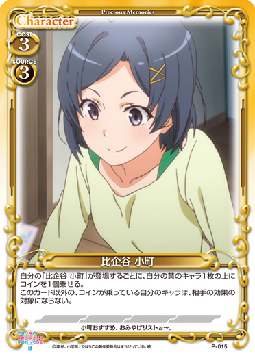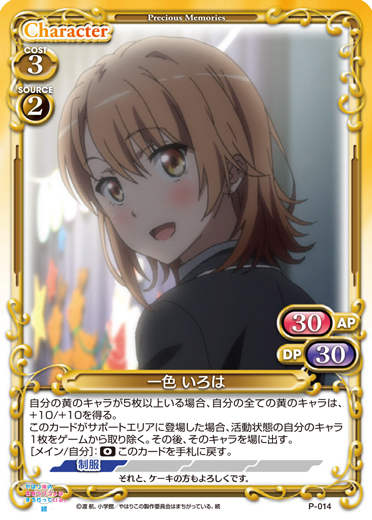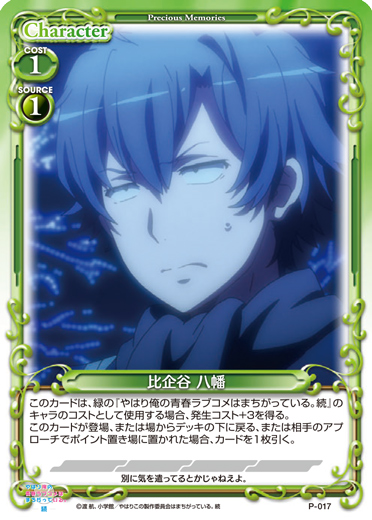 | このカードは、緑の『やはり俺の青春ラブコメはまちがっている。続』のキャラのコストとして使用する場合、発生コスト+3を得る。このカードが登場、または場からデッキの下に移る、または相手のアプローチでポイント置き場に置かれた場合、カードを1枚引く。 | ||