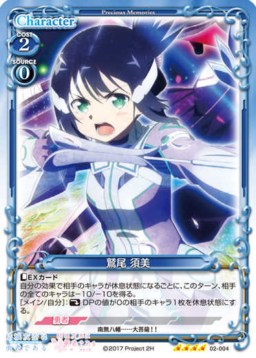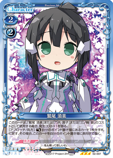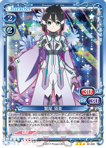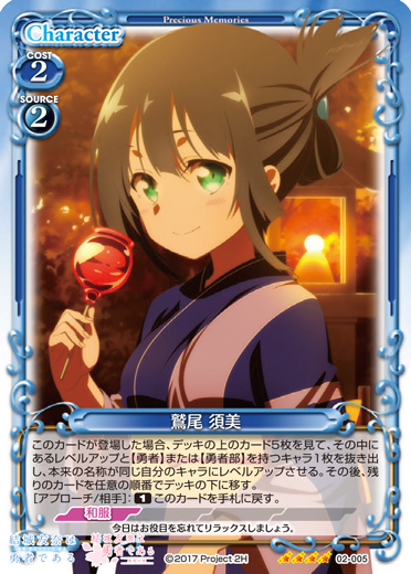 | このカードが登場、または相手のアプローチによってポイント置き場に置かれた場合、デッキの上のカード5枚を見て、その中にある「鷲尾 須美」1枚を抜き出し、表にしてから手札に加える。その後、残りのカードを任意の順番でデッキの下に移す。 | ||