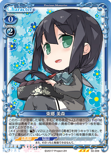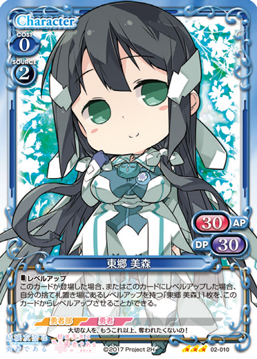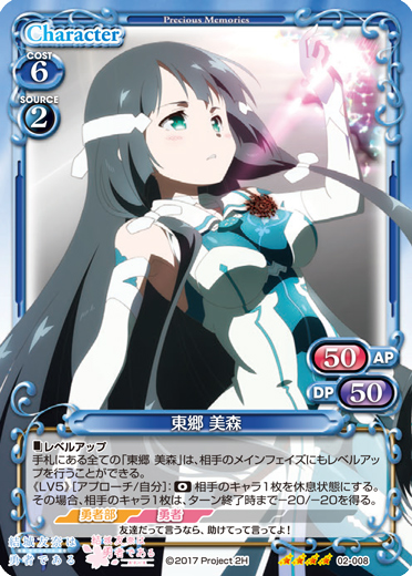 | 〔レベルアップ〕このカードが登場した場合、またはこのカードにレベルアップした場合、自分の捨て札置き場にあるレベルアップを持つ「東郷 美森」1枚を、このカードからレベルアップさせることができる。 | ||