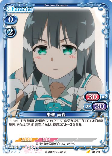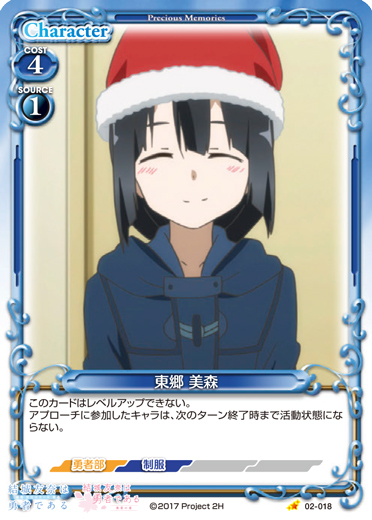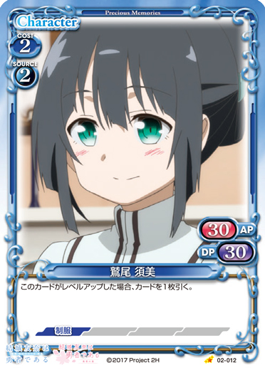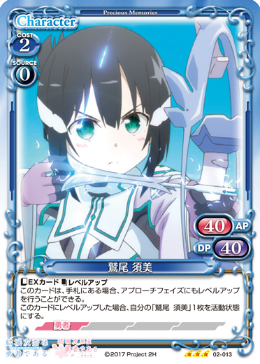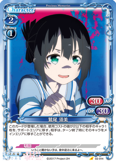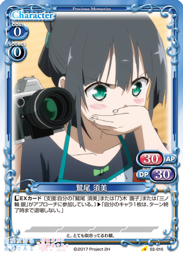 | このカードが登場した場合、EXデッキから「鷲尾 須美」または《使用条件》に「鷲尾 須美」を含むイベントカード1枚を抜き出し、表にしてから手札に加える。[アプローチ/自分]:《休》このカードをデッキの下に移す。その場合、使用コストの値が1以下の相手のキャラ1枚を休息状態にする。 | ||