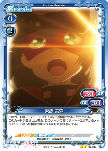 | このカードが登場した場合、このターン、自分が次にプレイする「鷲尾 須美」または「東郷 美森」1枚は、使用コスト-3を得る。 | ||