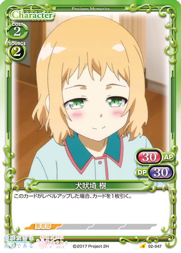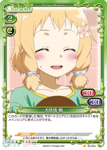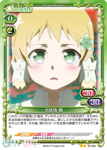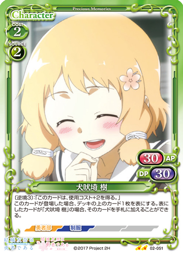 | 〔逆境3〕:「このカードは、使用コスト+2を得る。」このカードが登場した場合、デッキの上のカード1枚を表にする。表にしたカードが「犬吠埼 樹」の場合、そのカードを手札に加えることができる。 | ||