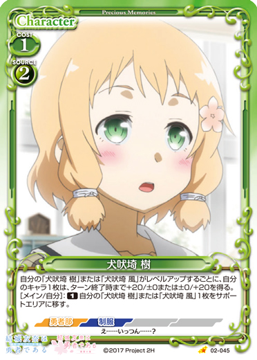 | 自分の「犬吠埼 樹」または「犬吠埼 風」がレベルアップするごとに、自分のキャラ1枚は、ターン終了時まで+20/±0または±0/+20を得る。[メイン/自分]:《1》自分の「犬吠埼 樹」または「犬吠埼 風」1枚をサポートエリアに移す。 | ||