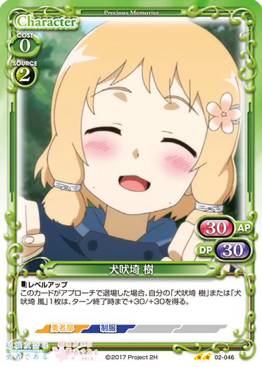 | 〔レベルアップ〕このカードがアプローチで退場した場合、自分の「犬吠埼 樹」または「犬吠埼 風」1枚は、ターン終了時まで+30/+30を得る。 | ||