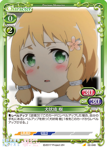 | 〔レベルアップ〕〔逆境3〕:「このカードにレベルアップした場合、自分の手札にあるレベルアップを持つ「犬吠埼 樹」1枚をこのカードからレベルアップさせる。」 | ||