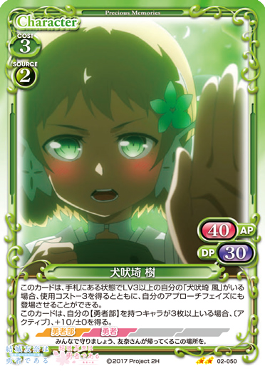 | このカードは、手札にある状態でLV3以上の自分の「犬吠埼 風」がいる場合、使用コスト-3を得るとともに、自分のアプローチフェイズにも登場させることができる。このカードは、自分の【勇者部】を持つキャラが3枚以上いる場合、〔アクティブ〕、+10/±0を得る。 | ||