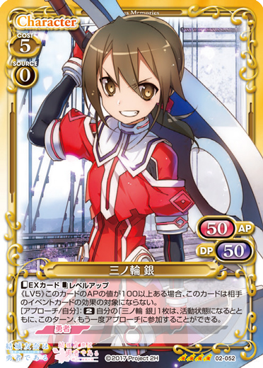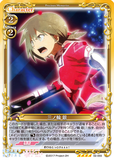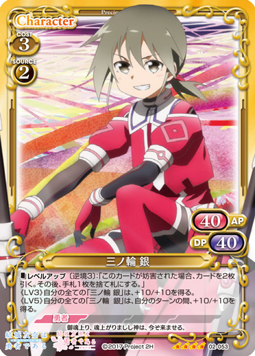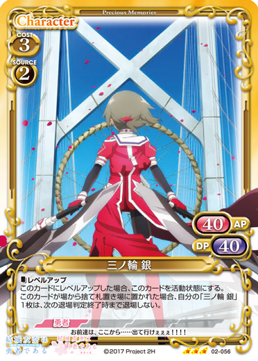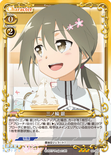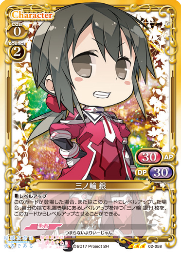 | 〔レベルアップ〕このカードが登場した場合、またはこのカードにレベルアップした場合、自分の捨て札置き場にあるレベルアップを持つ「三ノ輪 銀」1枚を、このカードからレベルアップさせることができる。 | ||