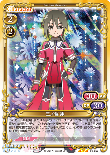 | このカードが登場、または相手のアプローチによってポイント置き場に置かれた場合、デッキの上のカード5枚を見て、その中にある「三ノ輪 銀」1枚を抜き出し、表にしてから手札に加える。その後、残りのカードを任意の順番でデッキの下に移す。 | ||