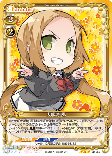 | 自分の「犬吠埼 風」または「犬吠埼 樹」がレベルアップするごとに、このターン、相手の全てのキャラは使用コスト-1を得る。[メイン/両方]:《1》サポートエリアにいる自分の「犬吠埼 樹」1枚は、ターン終了時まで相手のキャラの効果の対象にならない。 | ||