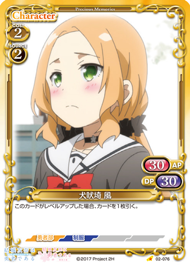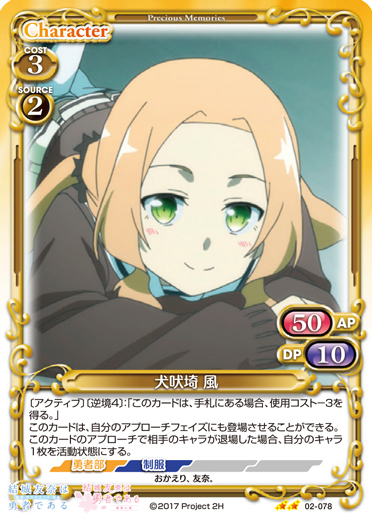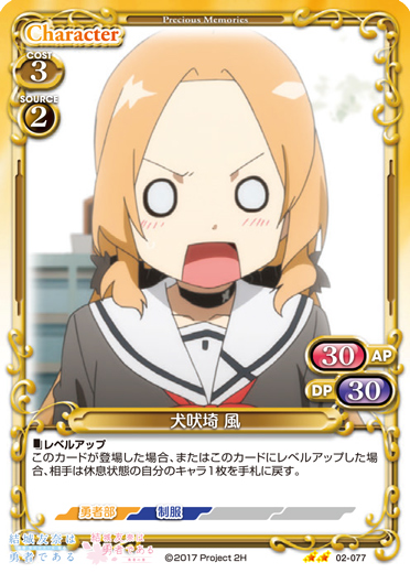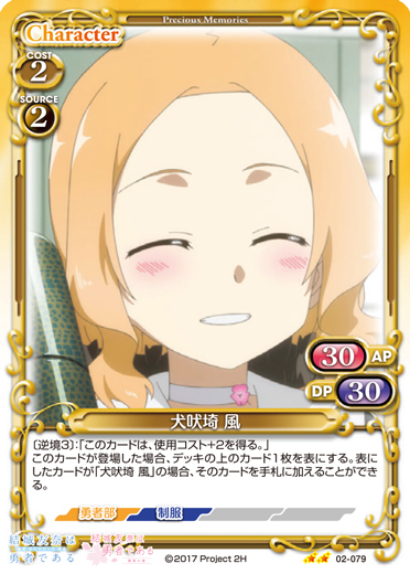 | 〔逆境3〕:「このカードは、使用コスト+2を得る。」このカードが登場した場合、デッキの上のカード1枚を表にする。表にしたカードが「犬吠埼 風」の場合、そのカードを手札に加えることができる。 | ||