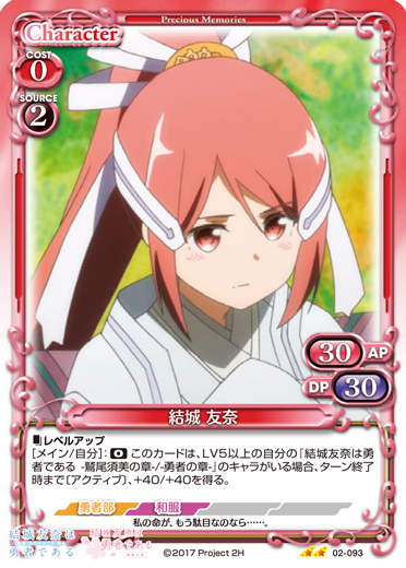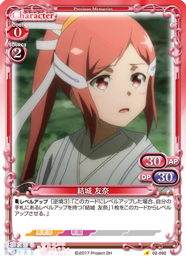 | 〔レベルアップ〕〔逆境3〕:「このカードにレベルアップした場合、自分の手札にあるレベルアップを持つ「結城 友奈」1枚をこのカードからレベルアップさせる。」 | ||