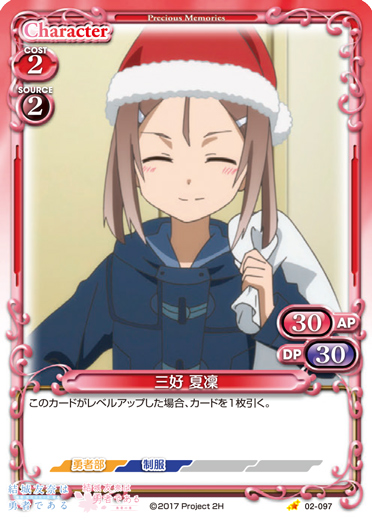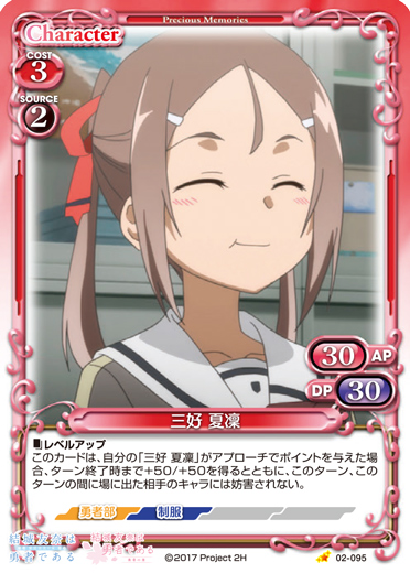 | 〔レベルアップ〕このカードがアプローチでポイントを与えた場合、自分の「三好 夏凜」または「結城 友奈」1枚は、ターン終了時まで+30/+30を得る。 | ||