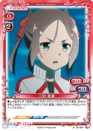 | 〔レベルアップ〕〔逆境3〕:「このカードにレベルアップした場合、自分の手札にあるレベルアップを持つ「三好 夏凜」1枚をこのカードからレベルアップさせる。」 | ||