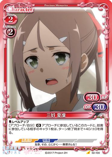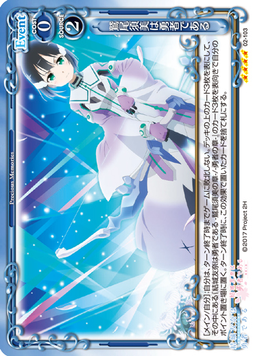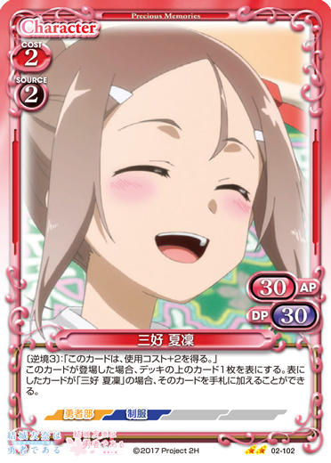 | 〔逆境3〕:「このカードは、使用コスト+2を得る。」このカードが登場した場合、デッキの上のカード1枚を表にする。表にしたカードが「三好 夏凜」の場合、そのカードを手札に加えることができる。 | ||