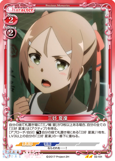 | 自分の捨て札置き場に「三ノ輪 銀」が3枚以上ある場合、自分の全ての「三好 夏凜」は〔アクティブ〕を得る。[アプローチ/自分]:《休》自分の捨て札置き場にある「三好 夏凜」1枚を、LV3以上の自分の「三好 夏凜」の一番下に重ねる。 | ||