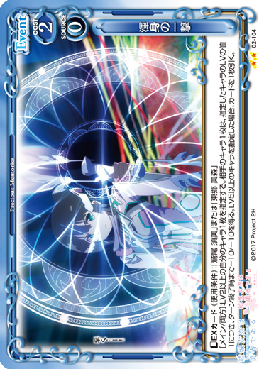| 〔EXカード〕 《使用条件》:「鷲尾 須美」または「東郷 美森」[メイン/両方]:LV2以上の自分のキャラ1枚を指定する。相手のキャラ1枚は、指定したキャラのLVの値1につき、ターン終了時まで-10/-10を得る。LV5以上のキャラを指定した場合、カードを1枚引く。 | ||