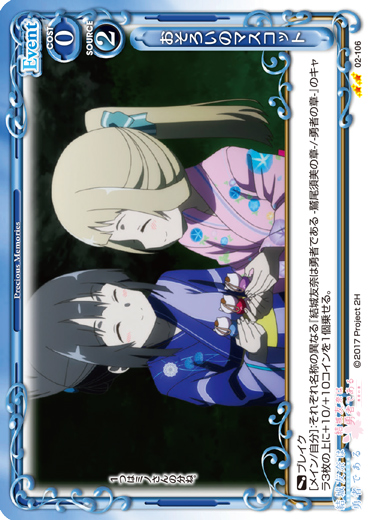 | 〔ブレイク〕[メイン/自分]:それぞれ名称の異なる『結城友奈は勇者である -鷲尾須美の章-/-勇者の章-』のキャラ3枚の上に+10/+10コインを1個乗せる。 | ||