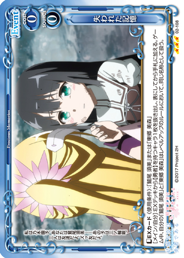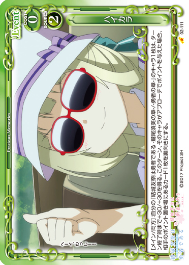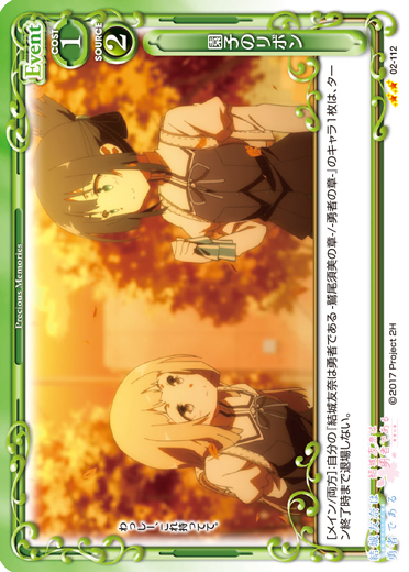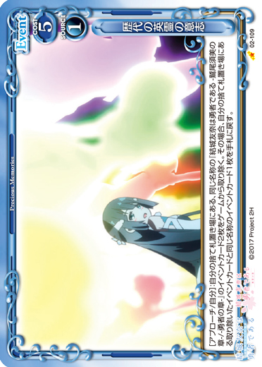 | [アプローチ/自分]:自分の捨て札置き場にある、同じ名称の『結城友奈は勇者である -鷲尾須美の章-/-勇者の章-』のイベントカード2枚をゲームから取り除く。その場合、自分の捨て札置き場にある取り除いたイベントカードと同じ名称のイベントカード1枚を手札に戻す。 | ||
