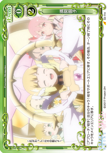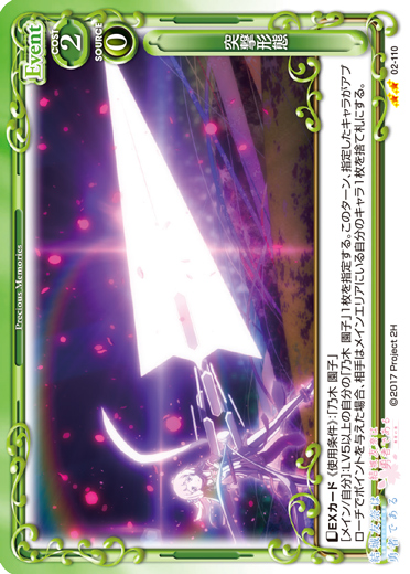 | 〔EXカード〕《使用条件》:「乃木 園子」[メイン/自分]:LV5以上の自分の「乃木 園子」1枚を指定する。このターン、指定したキャラがアプローチでポイントを与えた場合、相手はメインエリアにいる自分のキャラ1枚を捨て札にする。 | ||
