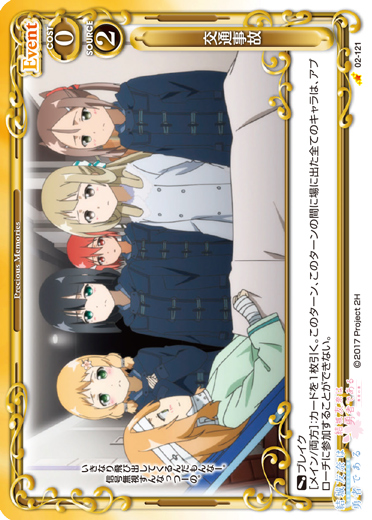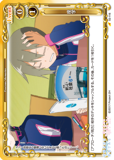 | 〔ブレイク〕[メイン/両方]:カードを1枚引く。このターン、このターンの間に場に出た全てのキャラは、アプローチに参加することができない。 | ||
