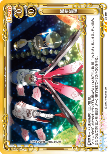 | 〔EXカード〕《使用条件》:「三ノ輪 銀」[メイン/自分]:自分のキャラの下に重ねられている「三ノ輪 銀」1枚を捨て札にする。その場合、自分の全ての「三ノ輪 銀」は、ターン終了時まで+30/+30を得る。 | ||