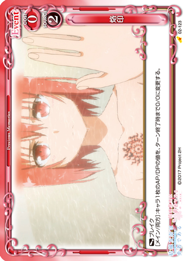 | 〔ブレイク〕[メイン/両方]:キャラ1枚のAP/DPの値を、ターン終了時まで0/0に変更する。 | ||