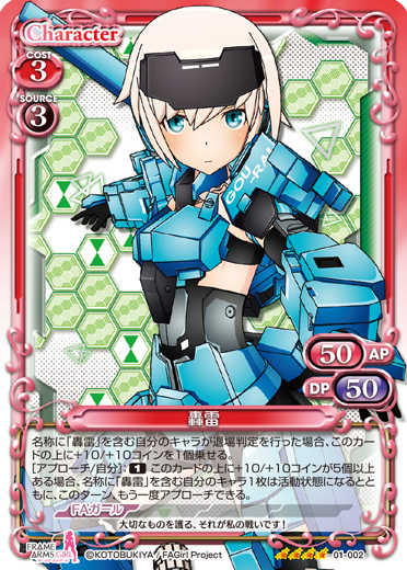 | このカードが登場した場合、EXデッキから名称に「轟雷」を含むキャラ1枚を抜き出し、手札に加える。[アプローチ/相手]:《休》名称に「轟雷」を含む自分のキャラ1枚の上に乗っている+10/+10コインを2個取り除く。その場合、このカードをデッキの下に移し、カードを2枚引く。 | ||