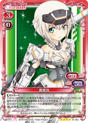 | このカードが登場した場合、EXデッキから名称に「轟雷」を含むキャラ1枚を抜き出し、手札に加える。このカードは、自分の「源内 あお」がいる場合〔我慢〕を得る。(〔我慢〕:このカードのDPが10以上の場合、このカードは退場しない。) | ||