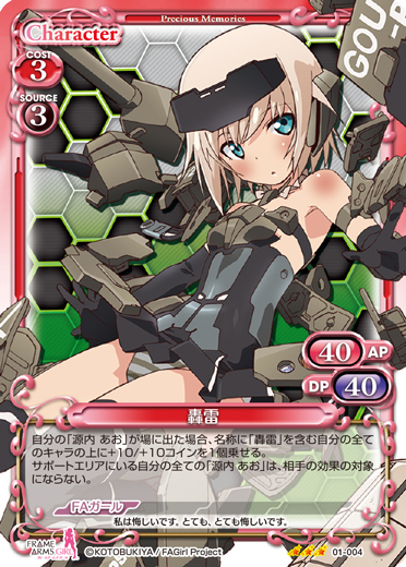 | 自分の「源内 あお」が場に出た場合、名称に「轟雷」を含む自分の全てのキャラの上に+10/+10コインを1個乗せる。サポートエリアにいる自分の全ての「源内 あお」は、相手の効果の対象にならない。 | ||