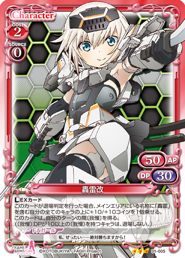 | 〔EXカード〕このカードが退場判定を行った場合、メインエリアにいる名称に「轟雷」を含む自分の全てのキャラの上に+10/+10コインを1個乗せる。このカードは、自分のターンの間〔我慢〕を得る。(〔我慢〕:このカードのDPが10以上の場合、このカードは退場しない。) | ||