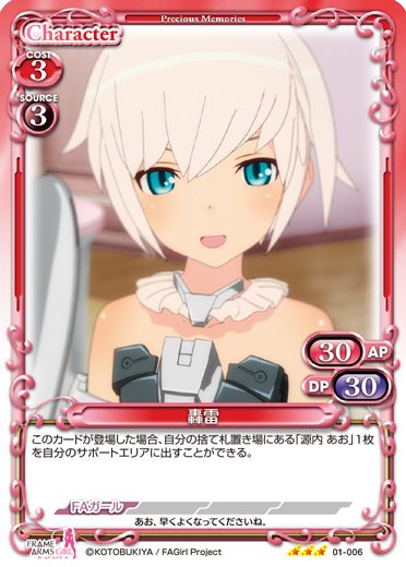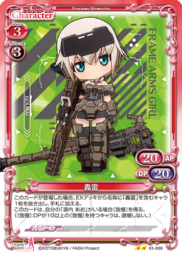 | 名称に「轟雷」を含む自分のキャラが退場判定を行った場合、このカードの上に+10/+10コインを1個乗せる。[アプローチ/自分]:《1》このカードの上に+10/+10コインが5個以上ある場合、名称に「轟雷」を含む自分のキャラ1枚は活動状態になるとともに、このターン、もう一度アプローチできる。 | ||