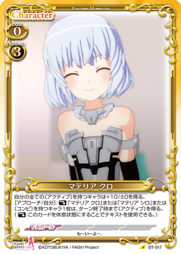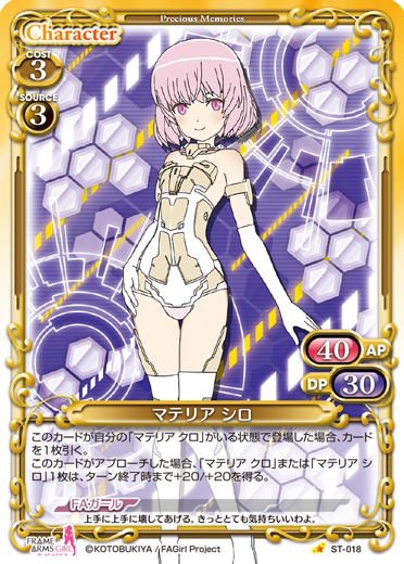| このカードが自分の「マテリア クロ」がいる状態で登場した場合、カードを1枚引く。 このカードがアプローチした場合、「マテリア クロ」または「マテリア シロ」1枚は、ターン終了時まで+20/+20を得る。 | ||