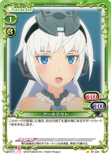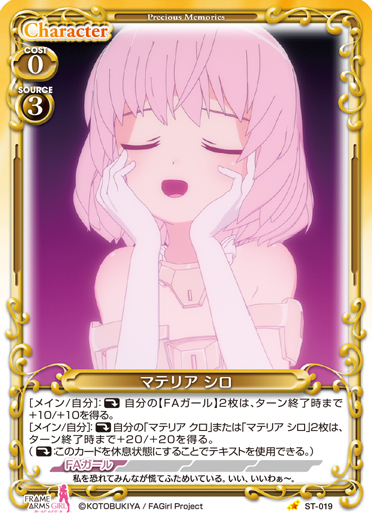 | [メイン/自分]《休》:自分の【FAガール】2枚は、ターン終了時まで+10/+10を得る。 [メイン/自分]《休》:自分の「マテリア クロ」または「マテリア シロ」2枚は、ターン終了時まで+20/+20を得る。 (《休》:このカードを休息状態にすることでテキストを使用できる。) | ||