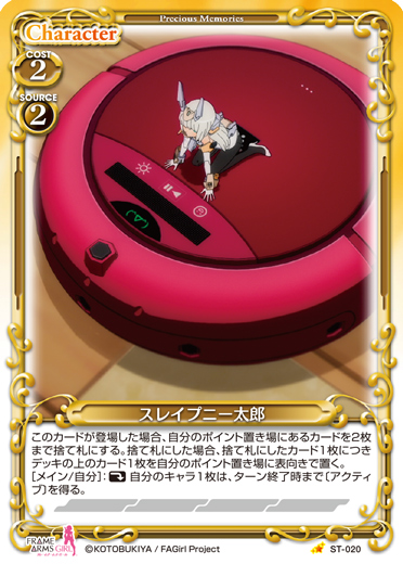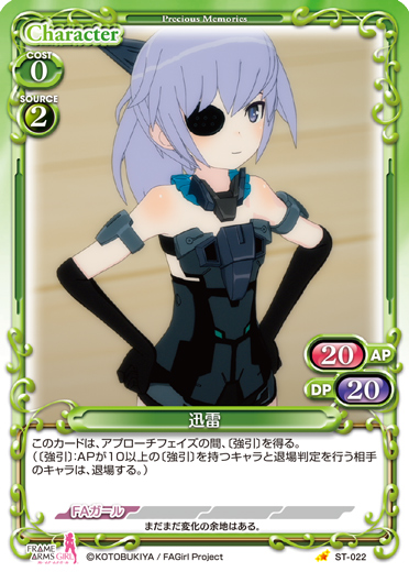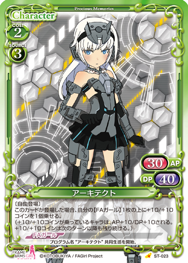 | 〔自由登場〕このカードが登場した場合、自分の【FAガール】1枚の上に+10/+10コインを1個乗せる。(+10/+10コインが乗っているキャラは、AP+10/DP+10される。+10/+10コインは次のターン以降も残り続ける。) | ||