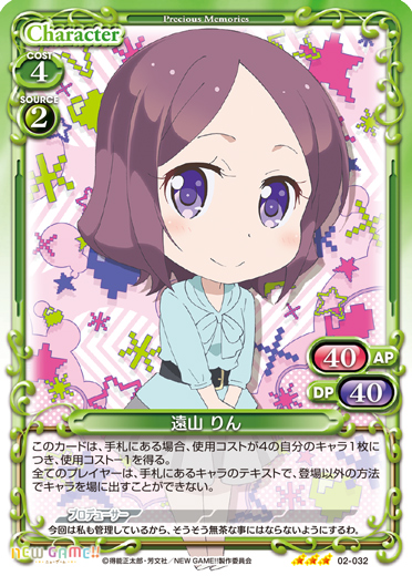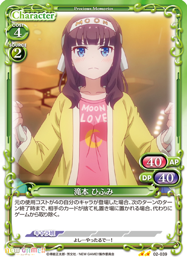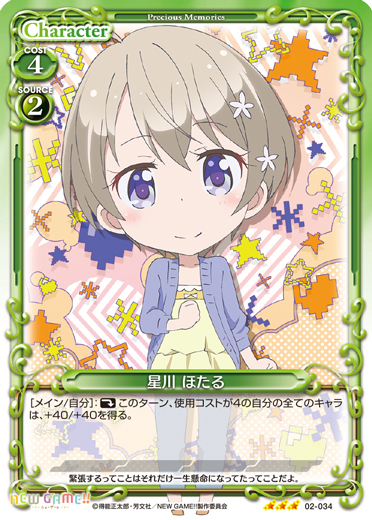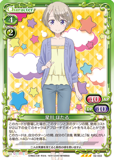 | [メイン/自分]:《休》このターン、使用コストが4の自分の全てのキャラは、+40/+40を得る。 | ||