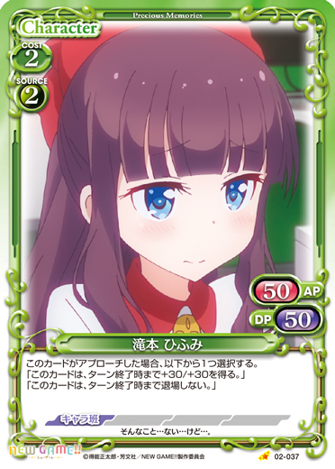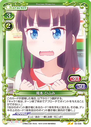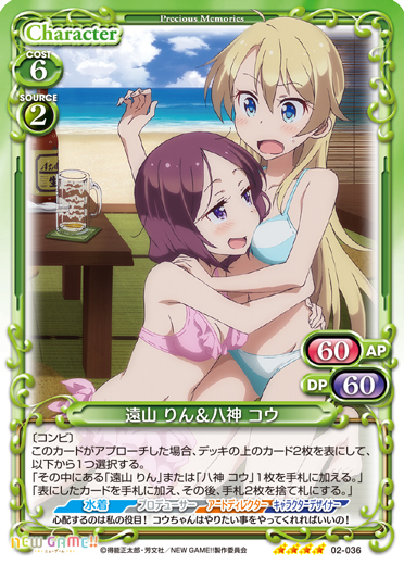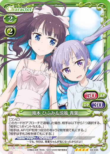 | 〔コンビ〕このカードがアプローチで退場した場合、相手は以下から1つ選択する。「相手に1ポイント与える。」「相手は、AP/DPを持つ自分のキャラ2枚を捨て札にする。」「相手は手札3枚を捨て札にする。」 | ||
