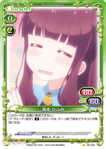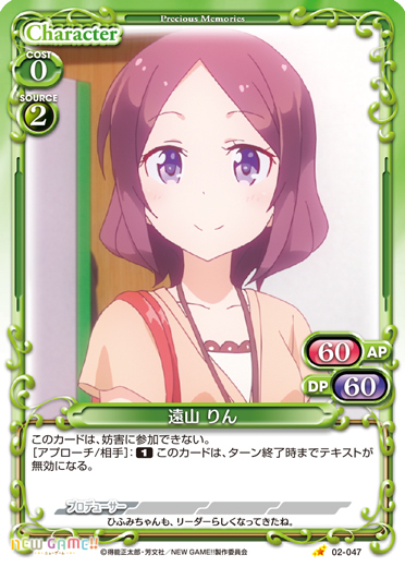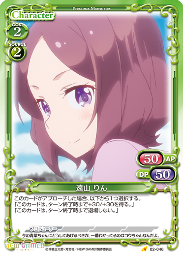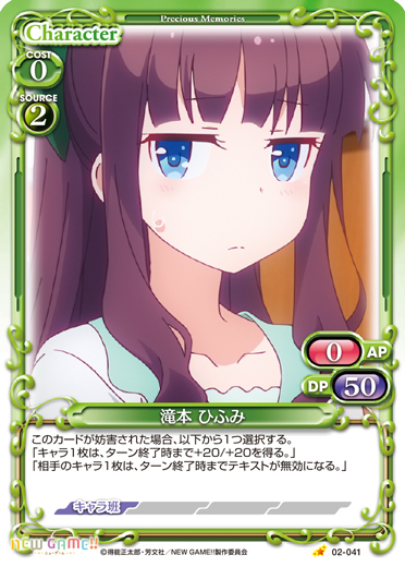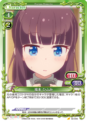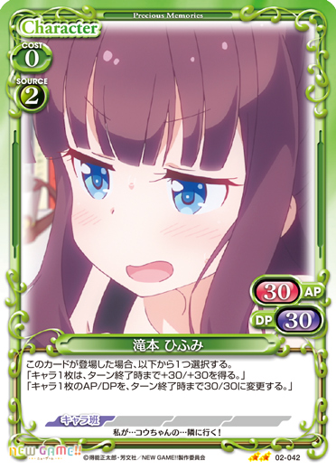| 元の使用コストが4の自分のキャラが登場した場合、キャラ1枚のAP/DPをターン終了時まで30/30に変更できる。 | ||