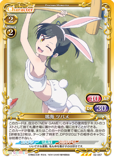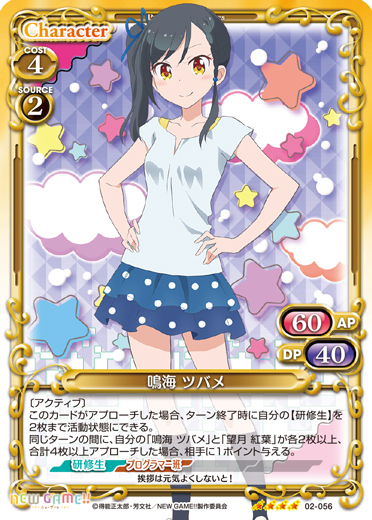 | 〔アクティブ〕このカードがアプローチした場合、ターン終了時に自分の【研修生】を2枚まで活動状態にできる。同じターンの間に、自分の「鳴海 ツバメ」と「望月 紅葉」が各2枚以上、合計4枚以上アプローチした場合、相手に1ポイント与える。 | ||