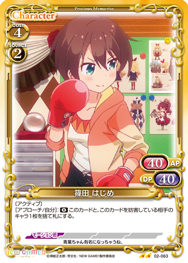 | 〔コンビ〕〔アクティブ〕このカードがアプローチした場合、相手のメインエリアにいる活動状態のキャラ1枚を指定する。このアプローチの間、相手は、指定されたキャラ以外ではこのカードを妨害できない。 | ||